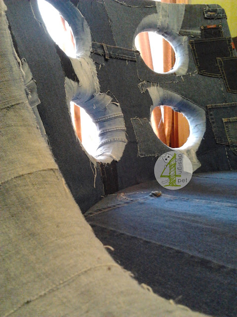Il tessuto utilizzato in questa trasformazione è l'indistruttibile e versatilissimo jeans, una tela in fibra di lino e cotone a doppia trama famosa per la sua resistenza e per la bellezza che l'usura conferisce nel tempo alla stoffa.